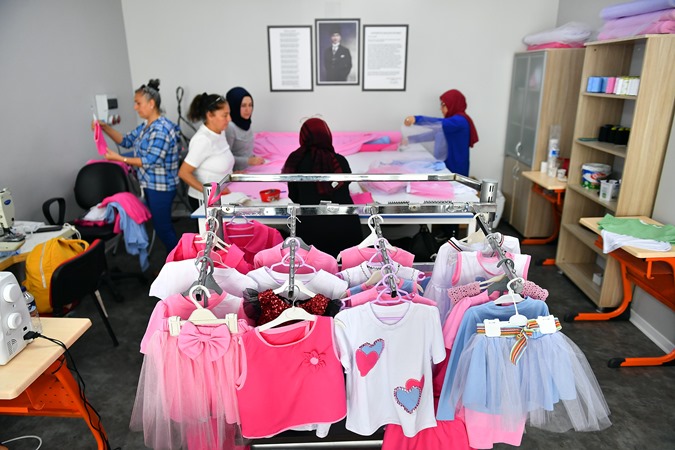 Mersin Büyükşehir Belediyesi Sosyal Hizmetler Dairesi bünyesinde faaliyetlerini yürüten Mesleki Eğitim Merkezi'nde (MERCEK) yer alan dikiş kursunda kadınlar, modern ekipmanlarla dikiş öğrenirken ürettikleri tişört, pijama takımı, etek, elbise gibi birçok ürün ihtiyaç sahibi ailelerin çocuklarına ücretsiz olarak ulaştırılıyor.