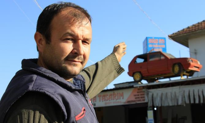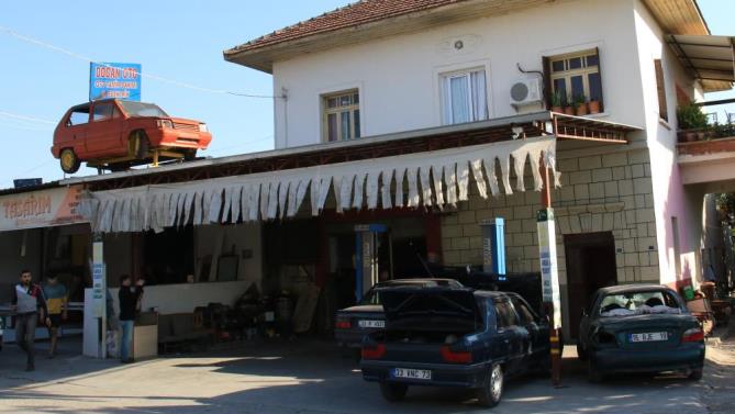 Erdemli ilçesi Tömük Mahallesi’nde 20 yıldır oto tamircilik yapan Mehmet Şahin Doğan, kendisi ile kardeşinin 7, komşularının ise 4 yıl kullandığı otomobili çatıya çıkarıp hem adres tarifi hem de tabela olarak kullanmaya başladı. 4 yıl önce vinç yardımı ile iş yerinin çatısına çıkartılan 28 yaşındaki otomobil hem yoldan geçenlerin dikkatini çektiği, hem de adres tarifi için kolaylık sağladığı belirtildi.