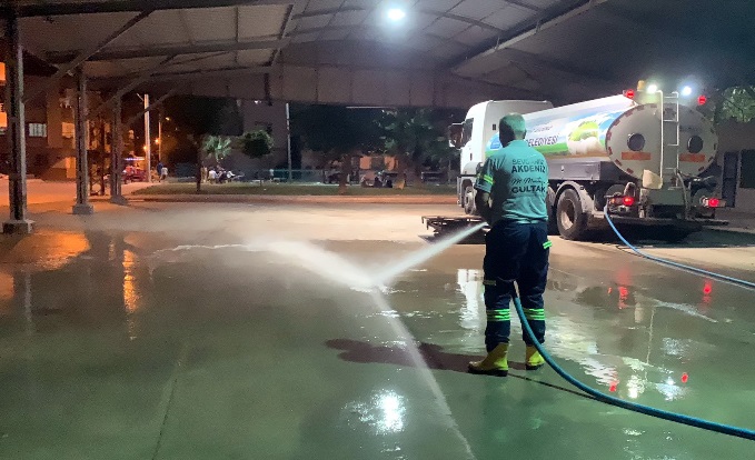 Yedi gün 24 saat aralıksız hizmet veren ekipler, hastane bahçeleri, balık pazarı, kasaplar çarşısı ile insan hareketliliğinin yoğun olduğu yerlerin zeminlerini de tazyikli ve dezenfektanlı su ile yıkayıp temizliyor.