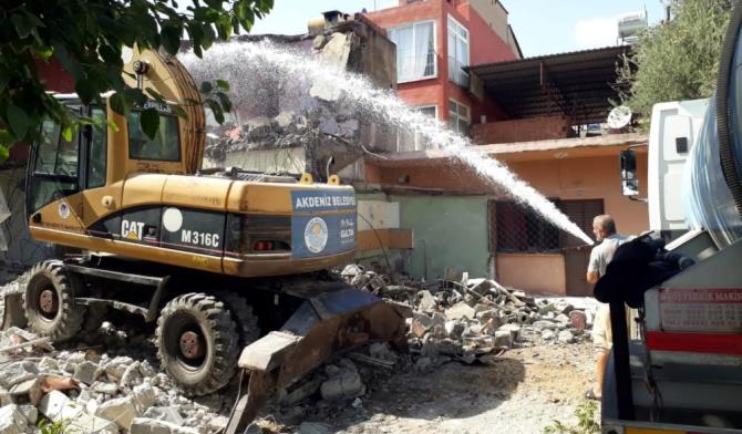 Mersin’in merkez ilçe Akdeniz Belediyesinden yapılan açıklamaya göre, kentin estetiğini bozmasının yanı sıra vatandaşların can ve mal güvenliğini tehdit eden, kimi zaman da madde bağımlılarının mekanına dönüştüğü için sosyal sorunlara yol açabilen terk edilmiş yapıların yıkım çalışmalarına hız verildi. Bu kapsamda, Fen İşleri Müdürlüğü ekipleri, yasal süreçleri tamamlanan Üç Ocak Mahallesi 5413 Sokakta bulunan ve sahiplerince terk edildiği için zamanla harabeye dönen 2 katlı metruk yapının yıkımını gerçekleştirdi. Çevre güvenliği alınarak iş makinesi yardımıyla kontrollü gerçekleşen yıkımda ekipler, ortaya çıkacak toz bulutunu önlemek için de yapıya arazözle su sıktı. Diğer bir ekip ise Gündoğdu Mahallesi 5764 Sokakta bulunan Gündoğdu Camisinin bitişiğindeki ömrünü tamamlamış olan 3 katlı lojman ve ek yapının yıkımını da yine kontrollü bir şekilde gerçekleştirdi.