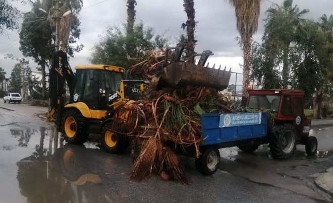 Öte yandan Kiremithane Mahallesi 4417 Sokak üzerinde bulunan bir yapının üzerinde, şiddetli rüzgâr sonucu zarar gören ve can güvenliği açısından tehlike arz eden çatı kaplaması da fen işleri ekipleri tarafından vinç yardımı ile indirilip tehlike ortadan kaldırıldı.