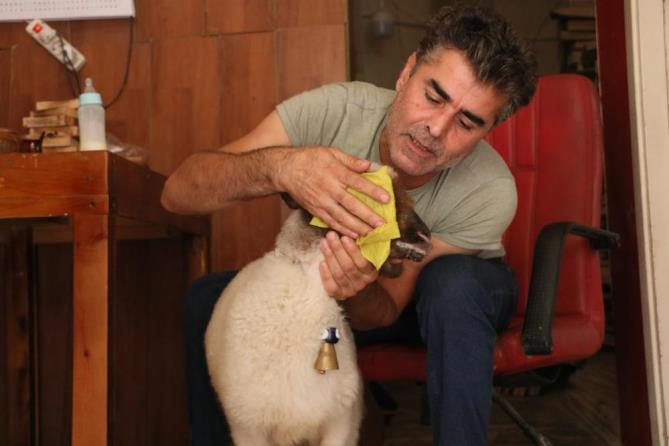 Hep böyle bir hayvan sahiplenmeyi düşünüyordum. Kasaba gittiğimde bunu gördüm, daha 4 günlüktü. Sahibi ölür diye söyledi ama ben yine de aldım. Biberonla süt vererek büyüttüm. Şu anda da benden ayrılmaz. Nereye gitsem yanımda. Banyosunu yaptırırım, günde 3-4 litre süt içiririm” dedi.