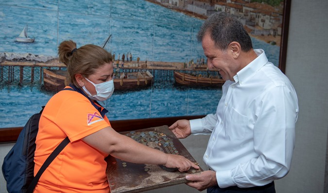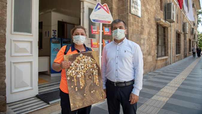 Özellikle bozuk para, evsel atık ve diğer farklı pek çok atığı değerlendirerek birbirinden güzel eserler ortaya çıkaran Dilek Cansız, 5 Haziran Dünya Çevre Günü’nde yaptığı tablolardan bir tanesini Başkan Seçer’e hediye etti. Dilek Cansız’ın eski mutfak dolabı kapağı üzerine bozuk paralar ve iple kadın figürünü bir ağaç gövdesi şeklinde ortaya çıkardığı tabloyu Başkan Seçer çok beğendi. Ziyarette saha temizlik personeli Dilek Cansız’a, Büyükşehir Belediyesi Çevre Koruma ve Kontrol Dairesi Başkanı Dr. Bülent Halisdemir de eşlik etti.