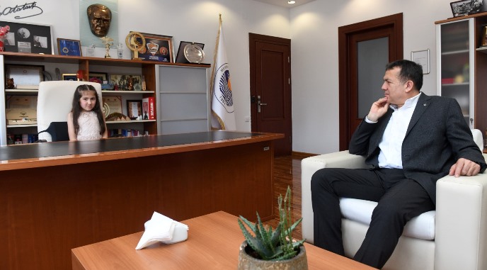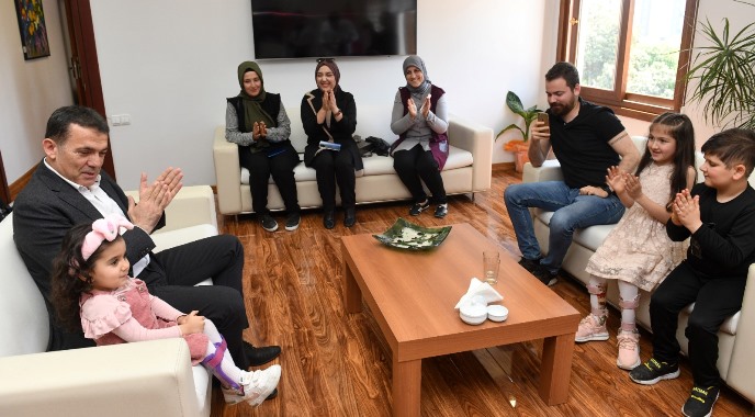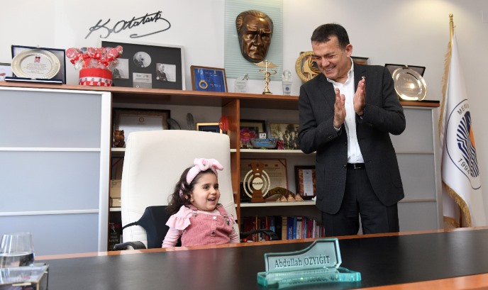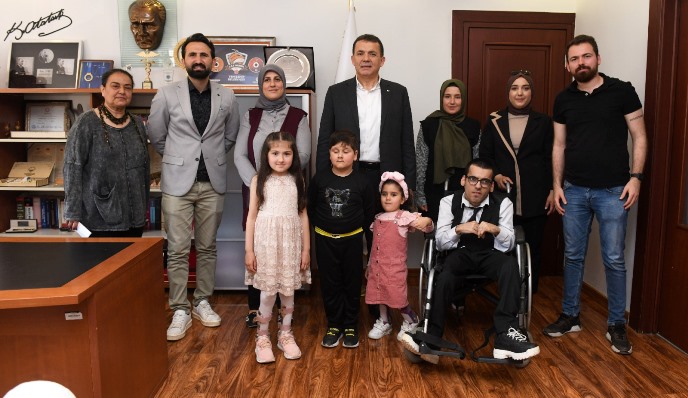 Özel çocuklar Abdulkadir Evirgen, Erva Güneş Kalkan, Azra Yağmur Çelik ve Mertcan İçyer’i makamında ağırlayan Yenişehir Belediye Başkanı Abdullah Özyiğit başkanlık koltuğunu çocuklara bıraktı.