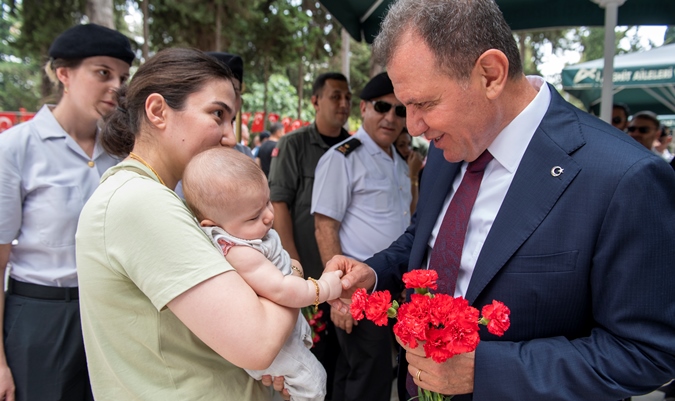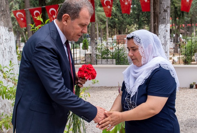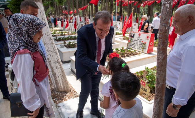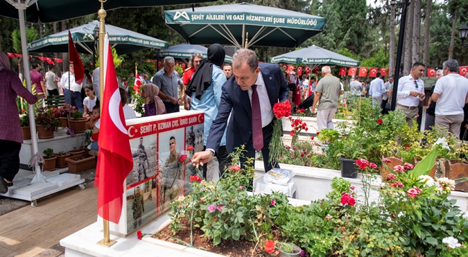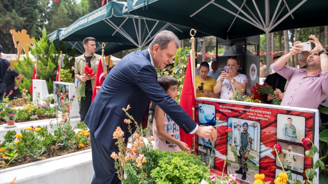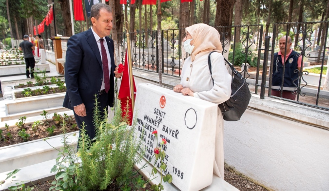 Törende, Kur’an-ı Kerim tilavetinin ardından, Mersin İl Müftüsü Aydın Yığman tarafından dua okundu. Ardından da Başkan Seçer ve kent protokolü tarafından şehit mezarlarına karanfiller bırakılırken, şehit aileleri ile bayramlaşıldı.