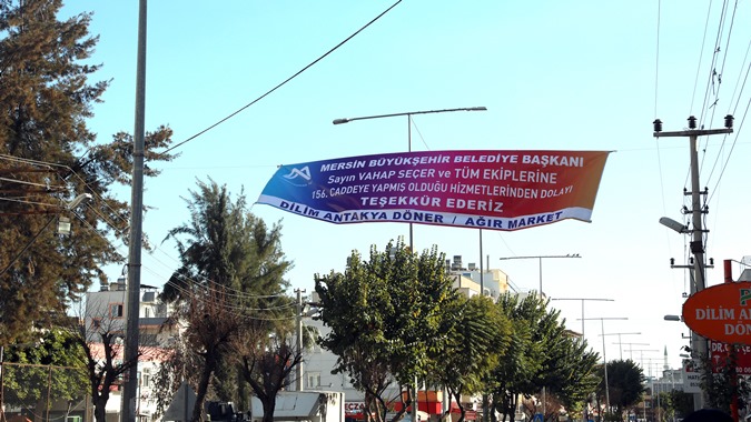 Şevket Sümer Mahallesi 156. Cadde’de dükkânları bulunan esnaf, Başkan Seçer’i, yola astıkları “Mersin Büyükşehir Belediye Başkanı Sayın Vahap Seçer ve tüm ekiplerine 156. Cadde’ye yapmış olduğu hizmetlerinden dolayı teşekkür ederiz” yazılı pankart ile karşıladı.