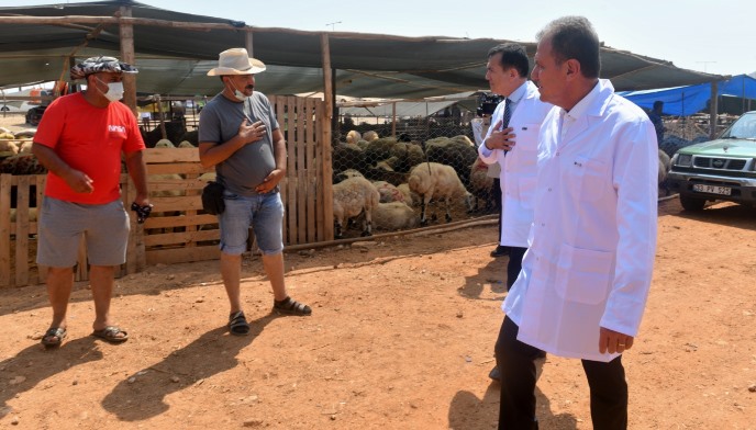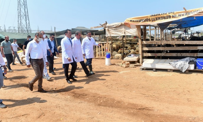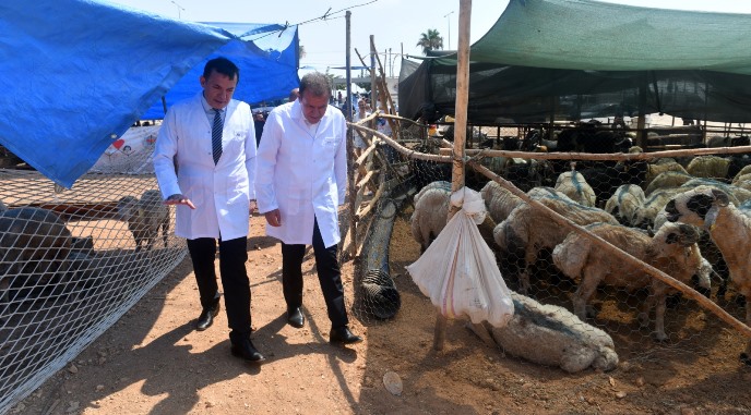 Mersin Büyükşehir Belediye Başkanı Vahap Seçer ve Yenişehir Belediye Başkanı Abdullah Özyiğit, Kurban Bayramı öncesinde Yenişehir Belediyesinin Deniz Mahallesinde kurduğu kurbanlık satış ve mobil kesim alanında incelemelerde bulundu.