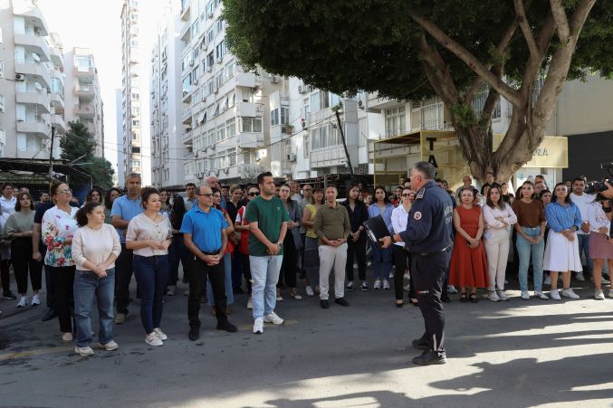 Mersin Büyükşehir Belediyesi İtfaiye Dairesi Başkanlığı’nda Eğitim Amiri olarak görev yapan Muharrem Çavdar, senaryo gereği bir tatbikat gerçekleştirdiklerini belirterek, “Bu tatbikata göre, birinci katta klima ünitesinden kaynaklanan bir yangın çıktı. Yangını gören personel, binanın yangın alarm butonlarına bastı. Akabinde personel, binanın yangın merdivenleri ve alt kattan tahliye edildi. Tahliye süresi ortalama 3,5 dakika sürdü ki, bu standartlara uygun bir değerdir” dedi.