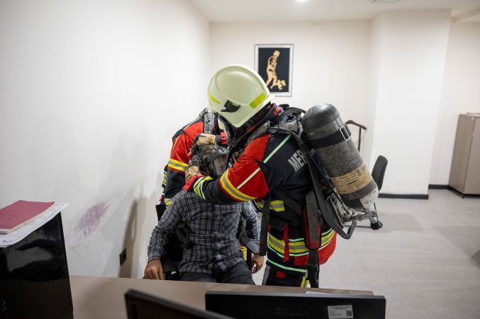 Birimlerin kendi aralarında personel yoklamalarını yaptığını ve yoklamalarda bir kişinin senaryo gereği alt katta mahsur kaldığı ve zehirli gazlardan etkilendiğinin gözlemlendiğini aktaran Çavdar, “‘Binaların yangından korunması’ yönetmeliği gereği binada bulunan kurtarma ve ilk yardım ekibindeki arkadaşlar; yangına ve dumana maruz kalan yaralı personelin koordinatlarını itfaiye ekiplerine bildirdi. İtfaiye ekipleri, solunum setleri ve tam teçhizatlı olarak içeriye girdiler. Zehirli gaza maruz kalan kişiye maske takarak, dışarıya tahliyesini gerçekleştirdiler” diye konuştu.