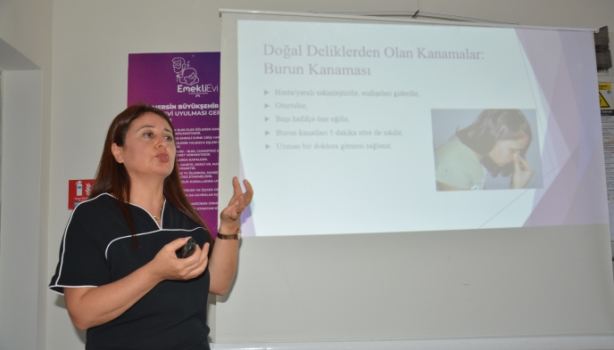 Kültür Park içersinde yer alan Tarsus Emekli Evi’nde gerçekleşen etkinliğe konuşmacı olarak katılan, Sağlık İşleri Dairesi Başkanlığı İlk Yardım Eğitim Merkezi Mesul Müdürü Sonay Kılıç, sunumuna ilk yardımın tanımını yaparak başladı.