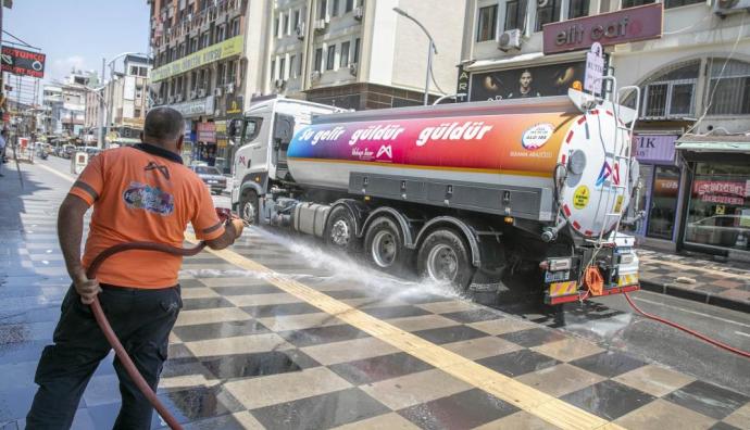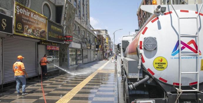 Çevre Koruma ve Kontrol Dairesi ise süpürme, yıkama, ilaçlama ve dezenfeksiyon çalışmalarını aralıksız sürdürüyor. Hafta içi 130 personelle yürütülen çalışmalar hafta sonu 70 personelle gerçekleştiriliyor. Çevre Koruma ve Kontrol Dairesinin Temizlik Şefi Danyal Güngör, merkez Akdeniz ilçesi Silifke Caddesinde yürütülen yol yıkama çalışmaları ile kent genelinde sürdürülen çalışmaları anlattı. Yasakların uygulandığı hafta sonu işlek caddelerde çalışmaları yoğunlaştıklarını belirten Güngör, “Özellikle Akdeniz ilçesinde çarşı merkezinde, İstiklal Caddesi, Silifke Caddesi ve Atatürk Caddesi gibi yerlerde hafta içi çok yoğun insan sirkülasyonu oluyor. Hafta içi özellikle insanların daha az olduğu yerlere yoğunlaşıyoruz. Hafta sonu ise tam aksine hafta içi yoğun olup da hafta sonu sakinleşen bölgelere yoğunlaşıyoruz. Kaldırımlarımızın tamamını basınçlı su yardımıyla yıkıyoruz. Yollarımıza dökülen katı maddeleri de vakumlu yol süpürme araçlarıyla temizliyoruz. Tertemiz bir hale getiriyoruz” diye konuştu. (Mersin Times)