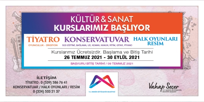 Kurslarda pandemi önlemlerine de azami özen gösterilecek ve gerekli önlemler alınacak. Bu kapsamda dersler en fazla 8 kişi olacak biçimde verilecek. Kurslar 26 Temmuz’da başlayıp, 30 Eylül’de son bulacak. Kurslarla ilgili detaylı bilgi tiyatro için 0539 586 76 41, konservatuar, halk oyunları ve resim için ise 0324 533 21 37 No’lu telefonlardan alınabilecek. (Mersin Times)