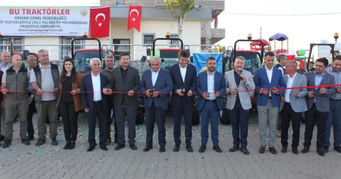 Traktörlerin anahtarları Milletvekili Hacı Özkan, Erdemli Kaymakamı Avni Kula, Erdemli Belediye Başkanı Mükerrem Tollu tarafından çiftçilere teslim edildi. (Mersin Times)
