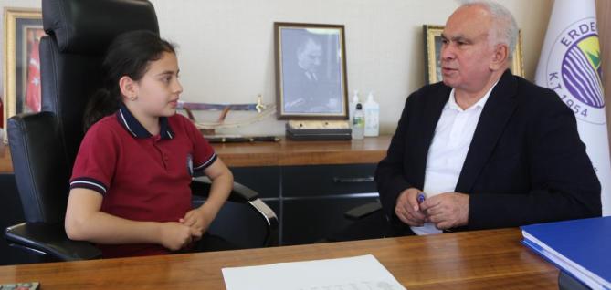 Erdemli İlkokulu öğrencileri Cemre Mina Cengiz ve Yiğit Eğriboyun, Okul Müdürü Şevki Ersoy ve sınıf öğretmeni Meliha Tekkolçak eşliğinde çiçeklerle Tollu’nun makamına geldi. 23 Nisan Ulusal Egemenlik ve Çocuk Bayramı dolayısıyla gerçekleştirilen devir teslim töreninde, öğrenciler Cemre Mina Cengiz ve Yiğit Eğriboyun, Tollu’nun koltuğuna oturarak belediye başkanlığı makamını devraldılar. Başkan koltuğuna oturmanın çok heyecan verici olduğunu belirten öğrenciler, Erdemli ile ilgili proje ve düşüncelerini anlattılar.
