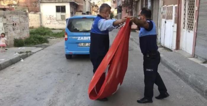 Edinilen bilgiye göre, Zabıta Müdürlüğü ekipleri, ilçeye bağlı Barış Mahallesi 128. Cadde üzerinde devriye attığı sırada, bir çöp tenekesi içine buruşturulmuş şekilde atılmış Türk bayrağı olduğunu fark etti. Hemen durarak çöpün içindeki büyük Türk bayrağını çıkaran ekipler, bayrağı önce temizlerken ardından katlayıp, öperek arabaya koydu. Çöpün içinde başka bayrak olup olmadığını da kontrol eden ekipler, uzun süre bölgede bayrağı çöpe atanı bulmaya çalıştı. Çevrede yapılan incelemede bayrağı çöpe kimin attığı belirlenemezken, bayrak tamamen temizlenip, asılmak üzere belediyeye götürüldü.