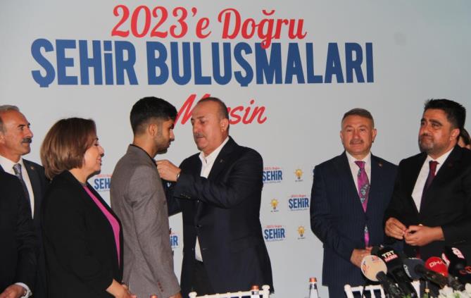 Çavuşoğlu, konuşmasının ardından AK Parti Mersin milletvekilleri ve İl Başkanı Cesim Ercik ile birlikte, partiye katılanlara rozet taktı. (Mersin Times)