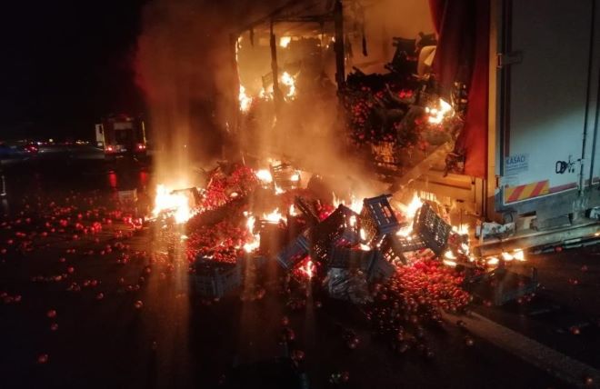 Alınan bilgiye göre, S.K.’nın sürücülüğünü yaptığı 20 ADU 309 plakalı kapalı kasa 16 ton domates yüklü kamyon, otoyolda Gaziantep istikametinde ilerlerken yanmaya başladı. Balataların ısınmasıyla çıktığı tahmin edilen yangını fark eden sürücü aracı güvenlik şeridinde durdurdu. İhbar üzerine olay yerine intikal eden Mersin Büyükşehir Belediyesi İtfaiye ekipleri müdahale ederek yangını söndürdü. Olayda maddi hasar meydana geldi. (Mersin Times)