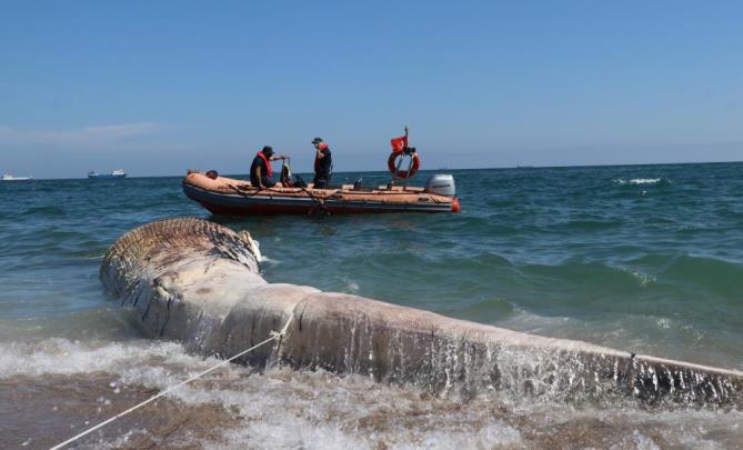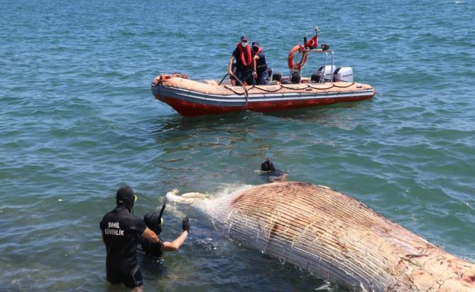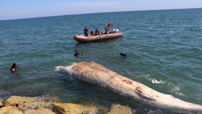 Çok büyük olmasından dolayı vinçle çıkarılması gereken balık, Sahil Güvenliğin balık adamları tarafından halatlarla bağlanarak, bota bağlanıp uygun yere çekilmesi sağlandı. Mersin Üniversitesi Su Ürünleri Fakültesi İşleme Teknolojisi Anabilim Dalı Öğretim Üyesi Prof. Dr. Deniz Ayas’da dünyanın en büyük ikinci balinası olan balığın bulunduğu bölgeye gelerek, incelemelerde bulundu. Bölgede yoğun bir koku oluşurken, çevrede bulunan apartmanlardaki vatandaşlarda meraklı gözlerle çalışmaları inceledi.