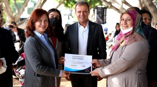Mersin Büyükşehir Belediyesi, kadınların evdeki gizli iş gücünü açığa çıkaran Evimiz Atölye projesini sürdürmeye devam ediyor. Büyükşehir Belediyesi Kadın ve Aile Hizmetleri Dairesi Gönüllüler Şube Müdürlüğü bünyesinde yürütülen ve Mersinden Kadın Kooperatifinin de paydaşı olduğu proje kapsamında, merkez Akdeniz ilçesine bağlı Siteler, Güneş ve Şevket Sümer mahallelerinden kursa katılan kadınlara katılım belgeleri verildi.