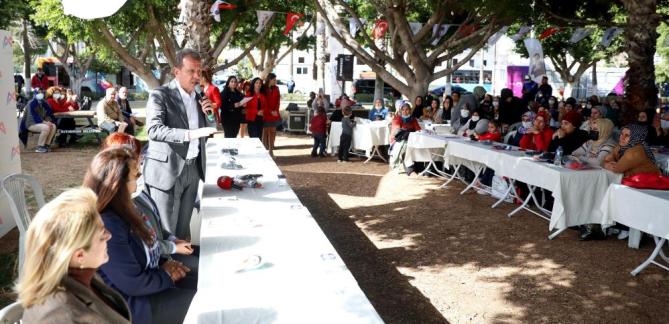 Mersinden Kadın Kooperatifi, Büyükşehir Belediyesinin Kadın Dairesi ve buraya bağlı Gönüllüler Birimine teşekkür eden Seçer, muhtarlarla iş birliği içinde çalışmalarını sürdürdüklerini söyledi. Seçer, “Bir teşekkür de muhtarlarımıza, çünkü işimizi kolaylaştıran, mahalleyle irtibatı sağlayan, kadınlarımızın oraya huzur içerisinde gelmenizi sağlayan onlar. Bunlar demek ki birlikle oluyor. Birlikten güç doğar, hizmet doğar” dedi.