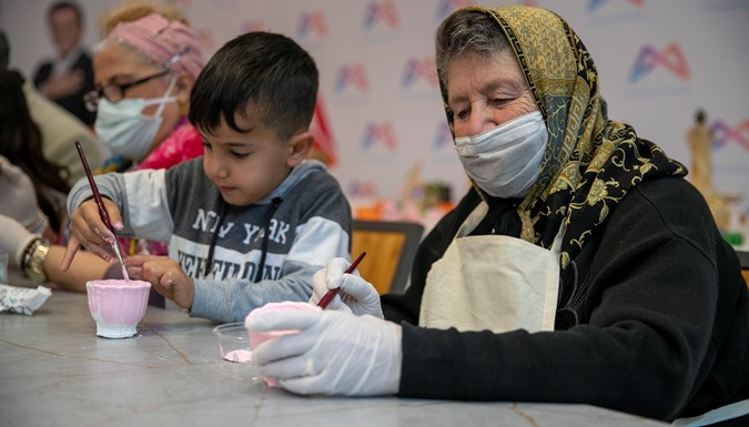 Büyükşehir, 18-24 Mart Yaşlılara Saygı Haftası kapsamında düzenlediği atölye çalışması ile yaş almışlar ve minikleri bir araya getirdi. Birlikte seramik boyayan, sohbet eden ve eğlenen katılımcılar, renkli görüntüler oluşturdu. Minikler etkinlik sonunda yaş almışlara kendi elleriyle yaptıkları ve içerisinde ‘Onlar Bizim Baş Tacımız’ yazan resimli teşekkür kartı hediye etti.