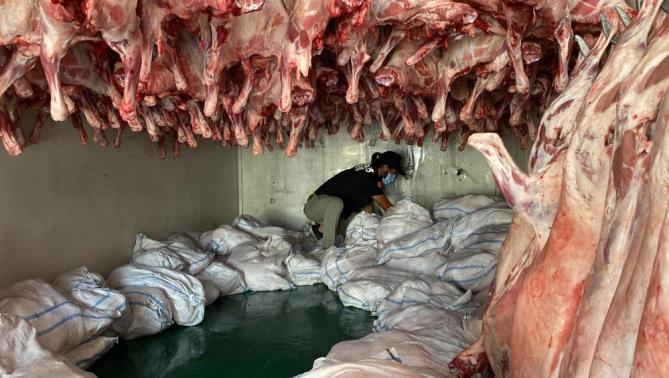 Alınan bir istihbarat üzerine Narkotik Şube Müdürlüğü ekiplerince durdurulan tırda yapılan aramada, etlerin içinde çuvallarla uyuşturucu madde olduğu tespit edildi.
