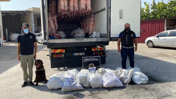 Bunun üzerine detaylı arama için emniyete çekilen tırda, narkotik dedektör köpeği Miror’un da katıldığı aramalarda etlerin içinde 1 çuval halinde 77 kilo 200 gram esrar ele geçirildi.