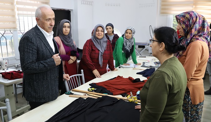 Kursiyer kadınlarla sohbet eden Başkan Gültak, “Mahalle evlerimiz fabrika gibi, buradaki kadınlar sürekli üretiyor; el işi, dikiş, nakış… Her şeyi öğreniyorlar. Tekstil kursumuzda eğitim gören kadınlarımızdan bazılarının kendisine, bazılarının da çocuklarına kıyafetler diktiklerini öğrendim. Kadınlarımız böylece hem evlerinin ekonomisine katkıda bulunuyor hem de meslek öğreniyor” dedi.