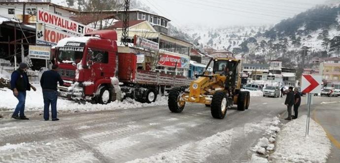 Mut Belediyesi ekipleri ilçenin yüksek kesimlerindeki kar yağışı nedeniyle kapanan yolları açarak, vatandaşların mağduriyetini gideriyor.