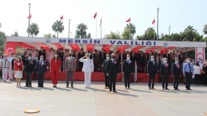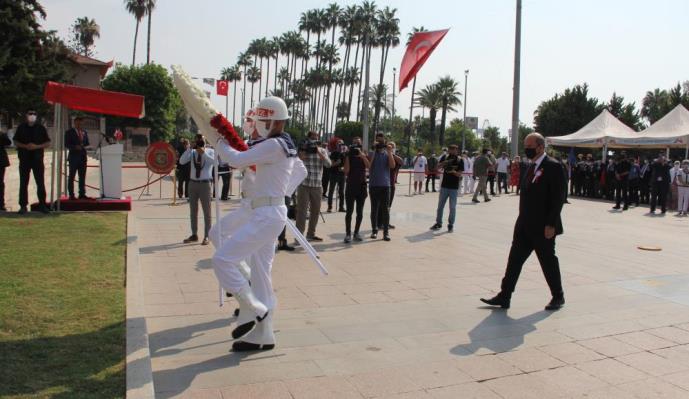 Saygı duruşu ve İstiklal Marşı eşliğinde Türk Bayrağının göndere çekilmesiyle başlayan törende, Cumhurbaşkanı Tatar ve gazi dernekleri tarafından Atatürk Anıtına çelenk sunuldu. Akdeniz Bölge ve Garnizon Komutanlığından bir subayın, günün anlam ve önemine ilişkin konuşması ve bir öğrencinin şiir okumasıyla devam eden törende, Cumhurbaşkanı Tatar da Kıbrıs’a dair kararlı politikalarını Mersin’den duyurdu.