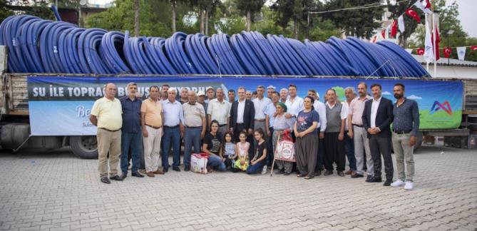 Mersin Büyükşehir Belediye Başkanı Vahap Seçer’in katılımıyla Toroslar ilçesi Dalakderesi Mahallesinde “Destek Büyükşehir’den Üretim Çiftçiden” mottosuyla ‘sulama borusu, kaz ve makine-ekipman dağıtım töreni’ düzenlendi. Düzenlenen törende, Akdeniz’e 3 bin 604 metre, Erdemli’ye 4 bin metre ve Toroslar’a da 5 bin 12 metre olmak üzere toplamda 12 bin 616 metre boru desteği yapıldı.