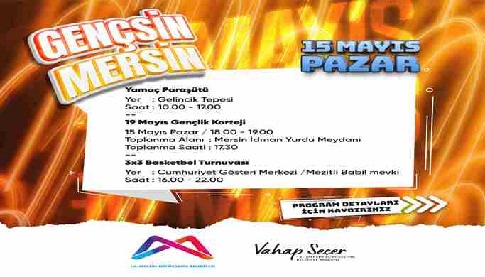 Mersin Büyükşehir Belediyesi, “19 Mayıs Atatürk’ü Anma Gençlik ve Spor Bayramı” dolayısıyla bu yıl da bir dizi etkinlikle kentte bayram havası estirecek. Büyükşehir Belediyesi Gençlik ve Spor Hizmetleri Dairesi, 19 Mayıs’ın 103’üncü yılında gençler için 8 gün sürecek dopdolu bir program hazırladı.