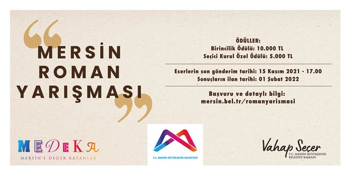 Mersin Büyükşehir Belediyesi bünyesindeki Mersine Değer Katanlar Kurulu (MEDEKA) tarafından düzenlenen roman ve fotoğraf yarışmasına başvurular başladı. Son başvuru tarihi 15 Kasım 2021 olan yarışmaların şartnameleri mersin.bel.tr/romanyarismasi ve mersin.bel.tr/fotografyarismasi sayfalarında yayımlandı.