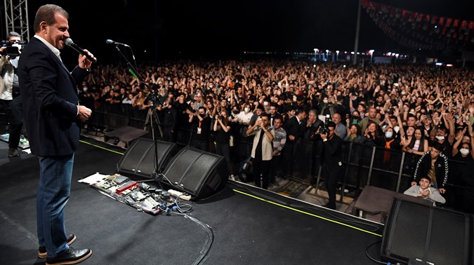 Mor ve Ötesi grubuna çiçek takdim ederek, coşkulu kitleye “Bakıyorum keyfiniz yerinde. Her şey güzel mi?” diye soran Başkan Seçer’e vatandaşlardan “Evet” cevabı geldi. Seçer, “Biz zaten her şey güzel olacak demiştik. Güzel oluyor mu? Çok daha güzel olacak, size söz veriyorum. Sevgili Harun; ben Ekşi Sözlük’te okudum, sizin şarkılar için diyor ki; ‘Mor ve Ötesi’nin şarkıları bir kaza raporu gibidir. Haysiyetli bir aşkın kaza raporu gibidir. Ama o şarkılar ki içi umut ve sevgi doludur.’ Bugün Cumhuriyet Bayramı. Cumhuriyet’in özü, içi umut ve sevgi doludur. Bayramınız kutlu olsun. Yaşasın Cumhuriyet” diye konuştu.