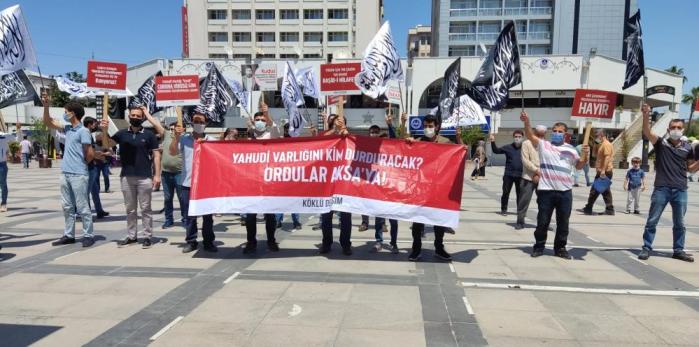 Namazın ardından grup adına açıklama yapan Hasan Gümüş, Filistinlilerin her günün sabahına zulümlerle uyandığını belirterek, “Neredeyse bir asırdır azgın işgalcilerin necis postallarıyla İsra ve Mirac topraklarımız kirletildi. Adet olduğu üzere gasıp Yahudi varlığı İsrail bu Ramazan ayında da Müslümanlara her türlü zulmü reva gördü. İslam beldelerinin yöneticilerinin sessizliğinden cesaret alan gasıp Yahudi varlığı İsrail çoluk çocuk, yaşlı genç demeden Müslümanları katletti, üzerlerine bomba yağdırdı. Ancak arada mesafeler olsa da Allah’a iman eden, kalbi Mescidi Aksa sevgisiyle dolu biz Müslümanlar kutsallarımızı sahipsiz bırakmadık ve kutsallarımıza sahip çıkmak adına elimizden gelen bütün gayreti gösterdik ve gösteremeye de devam edeceğiz” dedi. Grup, basın açıklamasının ardından olaysız bir şekilde dağıldı. (Mersin Times)