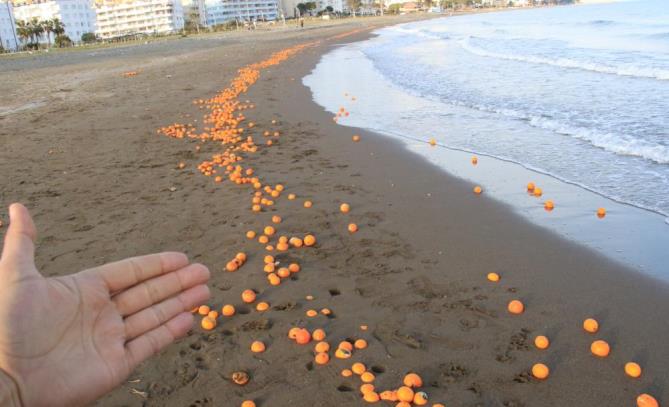 Tatil sitelerinin bulunduğu Erdemli ilçesine bağlı Arpaçbaşis Mahallesi sahiline yüzlerce portakal vurdu. Yüksek rakımdaki portakal bahçelerinin olduğu bölgeden Arpaçbahşis Deresi’ne atıldığı değerlendirilen portakallar, akıntıyla Akdeniz’e döküldü.
