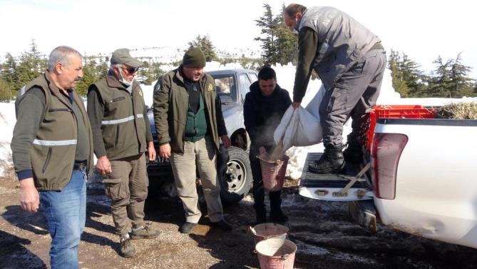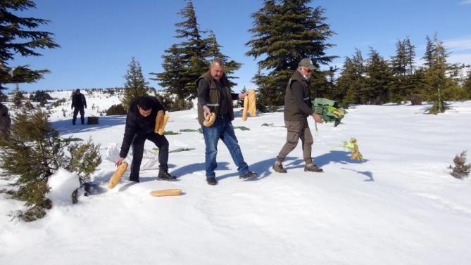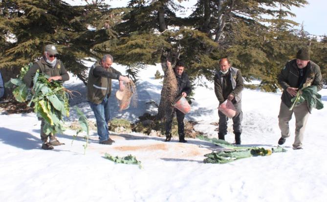 Karlarla kaplı bölgelerde gerçekleştirilen yemleme faaliyetleri ile yaban hayvanlarının yüksek rakımlı bölgelerde hayatlarını devam ettirmeleri destekleniyor. (Mersin Times)
