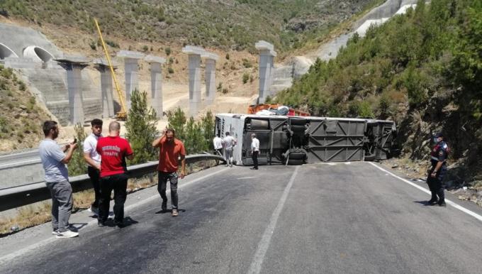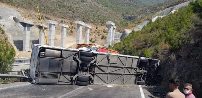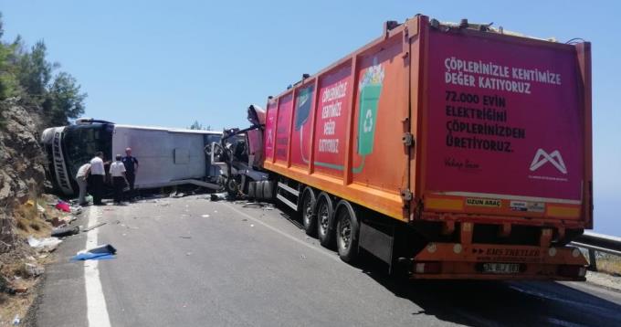 Alınan bilgiye göre, Şırnak’ın Cizre ilçesinden Antalya’nın Alanya ilçesine giden Selam Yalın’ın kullandığı 33 EC 647 plakalı yolcu otobüsü, Yenikaş Mahallesi D-400 karayolunda, Mersin Büyükşehir Belediyesine ait 34 GK 1482 plakalı geri dönüşüm malzemesi yüklü Hasan Endal yönetimindeki tırla çarpıştı.