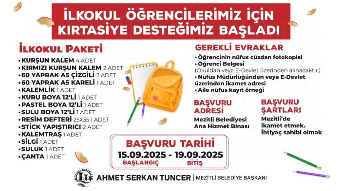 Mezitli Belediyesi, sosyal belediyecilik ilkesi doğrultusunda ilkokul öğrencilerine yönelik kırtasiye desteğini bu yıl da başlattı. 2025-2026 eğitim öğretim yılının başlamasıyla birlikte ihtiyaç sahibi öğrencilere kırtasiye yardımı sağlamak amacıyla başlatılan başvuru süreci, 15 Eylül Pazartesi günü başlayacak ve 19 Eylül Cuma günü sona erecek.