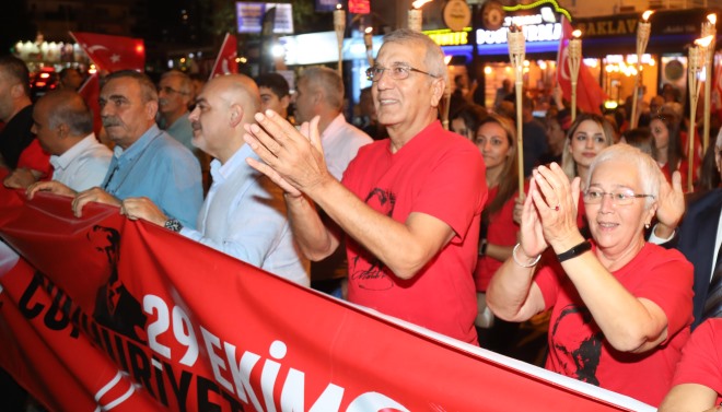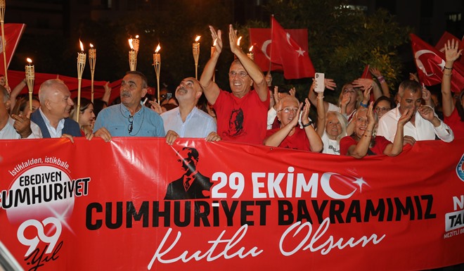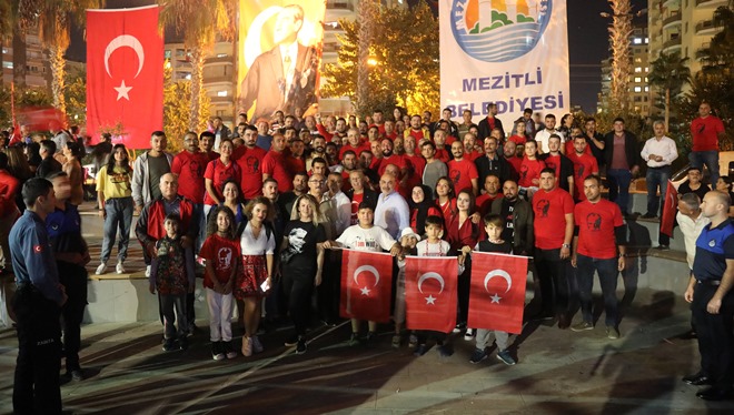 Mezitli Belediyesi tarafından 29 Ekim Cumhuriyet Bayramı kutlamalarına kapsamında meşaleli yürüyüş düzenlendi. Dev Türk Bayrağının ve Atatürk Bayrağının açıldığı yürüyüş boyunca Atatürk ve cumhuriyet sevdalısı gençler, meşaleler ve renkli sis bombaları ile geceyi kırmızıya boyadı. Mezitli Belediyesi çalışanlarının yanı sıra siyasi parti ve sivil toplum örgütü temsilcileri, belediye meclis üyeleri, mahalle muhtarlarının da katıldığı ve Mezitli Belediyesi eski hizmet binası önünden başlayan yürüyüşe, vatandaşlar da balkon ve pencerelerden atılan sloganlar ve alkışlarla eşlik etti. Korteje katılanlar slogan ve marşlarla Cumhuriyet Bayramı coşkusunu Mezitli geneline yaydı. Limon Caddesi ve Barbaros Hayrettin Paşa Bulvarı boyunca, Demokrasi Meydanına kadar alkış, slogan ve marşlarla devam etti.