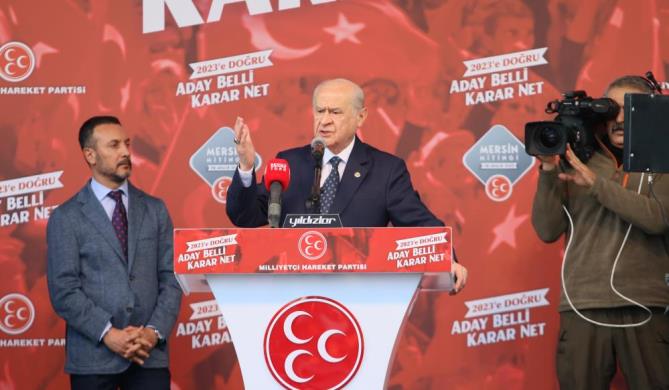 Bahçeli, Mersin Millet Bahçesi yanındaki miting alanında, partisince düzenlenen ‘2023’e Doğru: Aday Belli, Karar Net’ mitinginde vatandaşlara seslendi. Alandaki kalabalığı, “Başı Toroslar kadar dik, gönlü mavi vatan kadar engin Mersinli kardeşlerim” şeklinde selamlayan Bahçeli, “2023, sandık yılıdır, millet iradesinin bir kez daha tecelli edeceği, demokrasi yılıdır. Allah’ın izni, sizlerin desteği ile Çılgın Türklerin yeni bir şahlanış dönemi yaşanacaktır” diye konuştu.