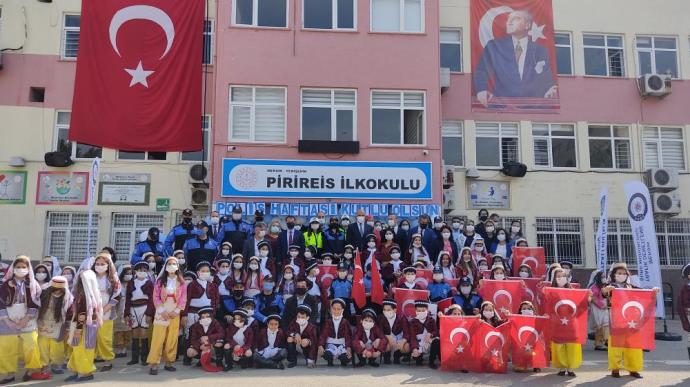 Mersin’in merkez Yenişehir ilçesinde bulunan Pirireis İlkokulu öğretmenleri ve öğrencileri tarafından hazırlanan Mersin Emniyet Müdürlüğü Toplum Destekli Polislik Şube Müdürlüğü ekiplerinin destekleriyle Türk Polis Teşkilatı’nın 176. kuruluş yıl dönümü düzenlenen etkinlikle kutlandı. İl Emniyet Müdürü Mehmet Şahne’nin de katıldığı etkinlikte, öğrenciler giydikleri polis kıyafetleriyle dikkat çekti. Saygı duruşu ve İstiklal Marşı’nın okunmasıyla başlayan etkinlikte, öğrenciler günün anlam ve önemini belirten şiirler okudu. Ardından Pirireis İlkokulu folklor ekibi tarafından yöresel halk oyunları sergilendi. Bir çok polis memuru gösterileri cep telefonlarıyla kaydetti.