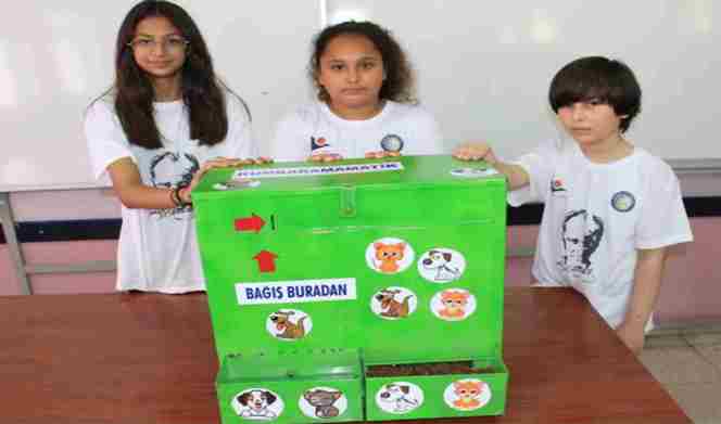Sokak hayvanlarını da unutmayan öğrencilerden Ekin Say da, kumbara mamatik geliştirerek, bağışlarla çalışan su ve mama bulunan cihaz yaptıklarını söyledi.
