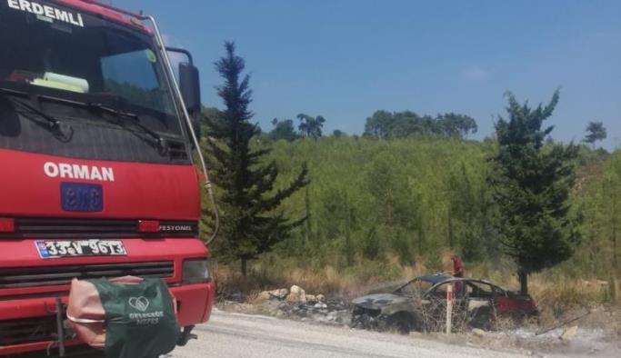 Edinilen bilgiye göre olay, ilçeye bağlı Karahıdırlı Mahallesi’nde yaşandı. İçerisinde 5 kişinin bulunduğu otomobilin motor kısmı, Tömük – Hacıalanı yol güzergahında seyrederken alev aldı. İddiaya göre sürücü otomobili durdurarak yolcuların dışarıya çıkmasını sağladı. Herkes çıktıktan sonra alevlerin kapladığı otomobil geri geri giderek yaklaşık 70 metre sonra yol kenarında ormanlık alanda bir ağaca çarparak durdu. İhbar üzerine Erdemli Orman İşletme Müdürlüğüne ait bölgede konuşlu arazöz ekipleri olay yerine gelerek yanan otomobil ve çevresine köpüklü su ile müdahalede bulundu.