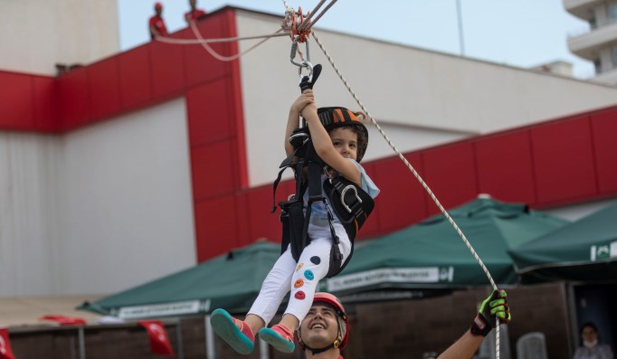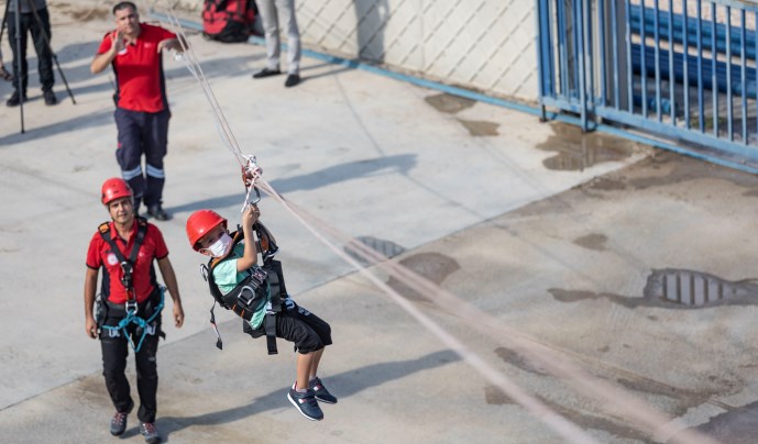 AFAD ekipleri tarafından deprem öncesi alınması gereken tedbirler ve deprem anında yapılması gerekenlerle ilgili de çocuklara bilgi verildi. Ardından Büyükşehir’in 1’i arama kurtarma çalışmalarında görev alan 4 köpeğiyle birlikte keyifli dakikalar yaşayan çocuklar, aksiyon dolu bir çalışmada daha yer aldı. İp tekniği kullanılarak kurtarma çalışmalarına katılan özel gereksinimli çocuklar, metrelerce yükseğe çıktı. Çocuklar, ip tekniğiyle yapılan kurtarma çalışmalarını deneyimlemenin de heyecanını yaşadı.
