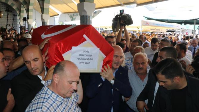 Mersin'de polisevine düzenlenen bombalı saldırıda şehit olan polis memuru Sedat Gezer, İçişleri Bakanı Süleyman Soylu'nun da katıldığı törenle son yolculuğuna uğurlandı. Bakan Soylu, şehidin cenazesini cami avlusundan cenaze aracına kadar omzunda taşıdı.