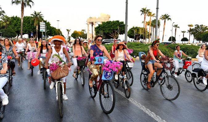 Süslü Kadınlar Bisiklet Turu’na katılan Sınıf Öğretmeni Süheyla Yüksel, “Mersin Bisikletli Kadınlar Grubu’ndayım. Aynı platformda arkadaşlarımızla çalışıyoruz. Bisiklet farkındalığını yaratmak için bu etkinliğe katılıyoruz. Bugün tüm dünyada, 42 ülkede ve şu anda Türkiye’de 200 şehirde aynı anda kutlanmakta. Mersin Büyükşehir Belediyesi çok büyük destek oluyor, teşekkür ediyoruz kendilerine. Hem katkı sunuyorlar, hem de bisiklet yollarımızı çok genişlettiler” dedi.