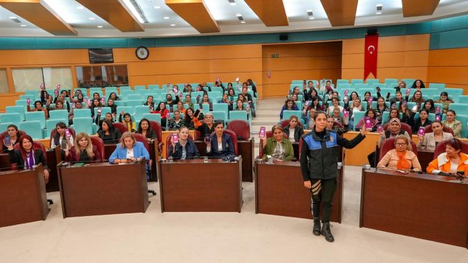 Meclis salonunda bir araya gelen belediye personellerine KADES eğitimi verildi; eğitim sonunda tüm personellerin telefonlarına KADES uygulaması yüklenerek olası acil durumlarda hızlı müdahale bilinci güçlendirildi. Ardından hazırlanan pano üzerine personelin turuncu el izleri yerleştirildi ve şiddete karşı ortak duruş güçlü bir sembolle ifade edildi.