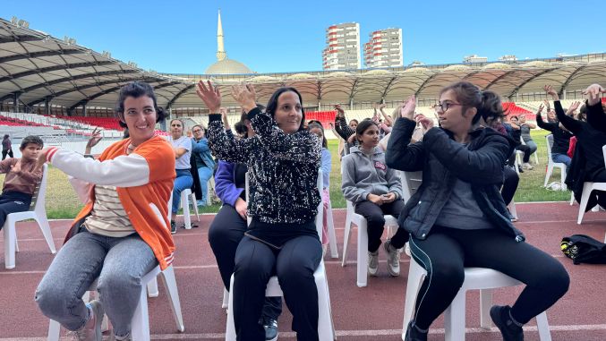 Katılımcılar, sandalyede oturarak ve bacaklarını kullanmadan gerçekleştirilen zumba çalışmasıyla, engelli bireylerin günlük yaşamda karşılaştıkları zorlukları bizzat deneyimleme fırsatı buldu.