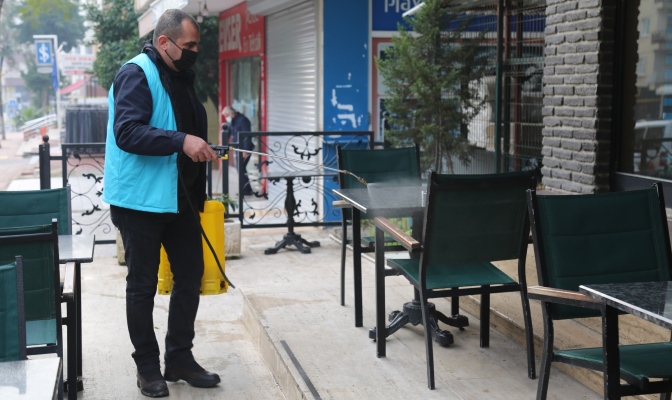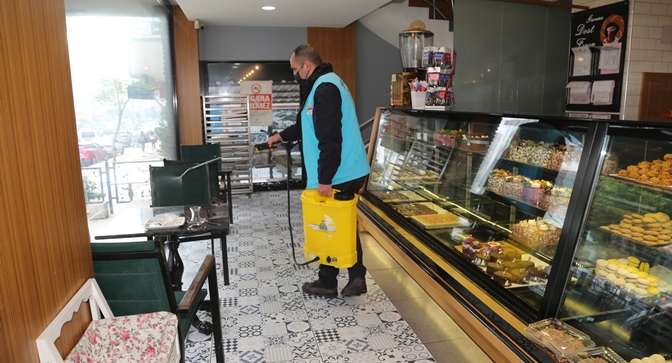 Temizlik İşleri Müdürlüğü ekipleri, ilçeyi karış karış geziyor. Ortak kullanım alanları olan ibadethanelerin yanı sıra işyerleri, kahvehaneler, taksi durakları, berber ve kuaför salonları düzenli olarak dezenfekte ediliyor.